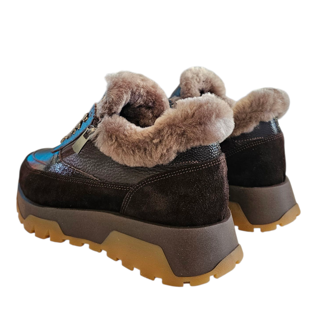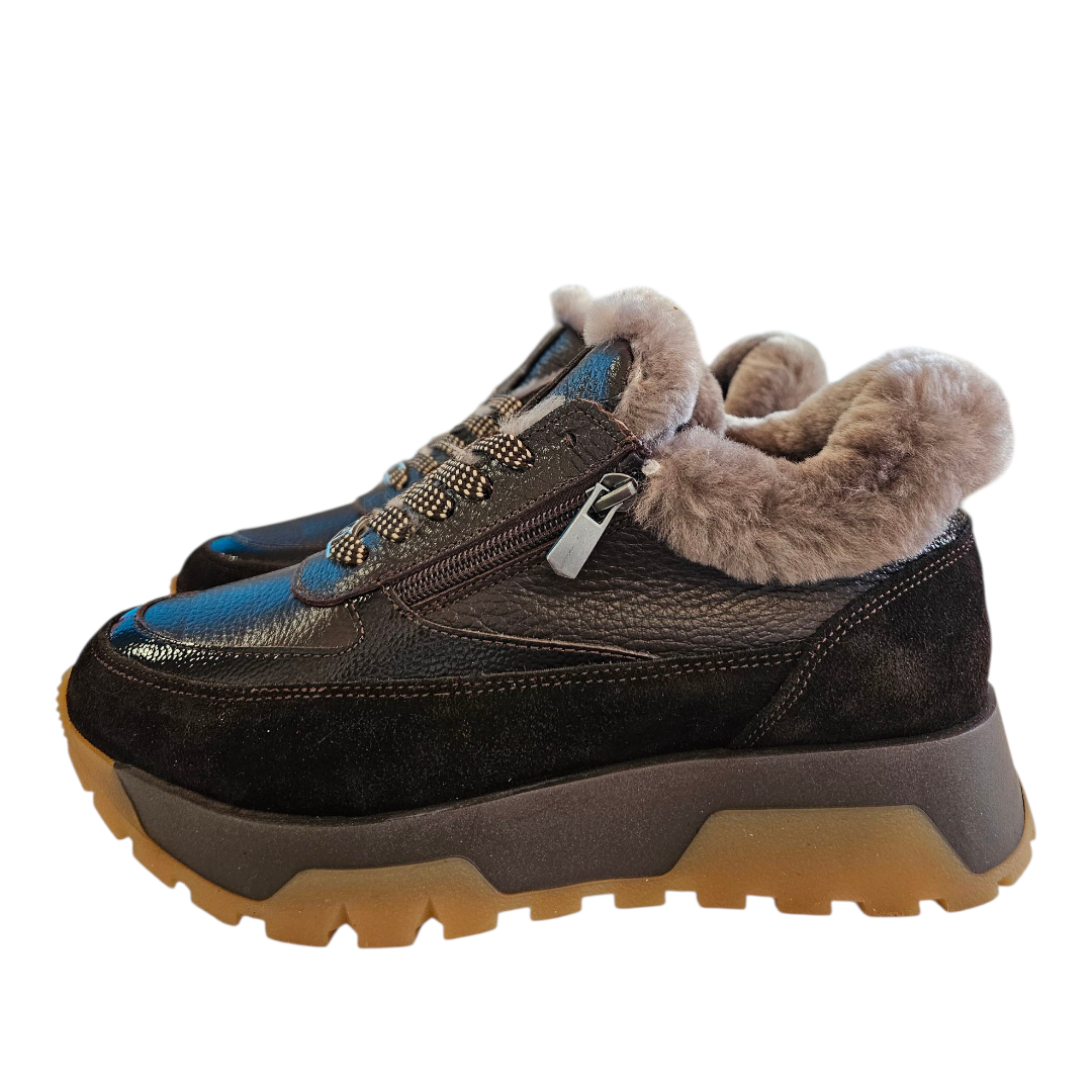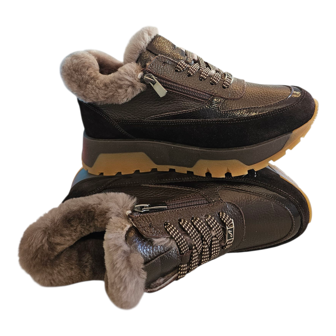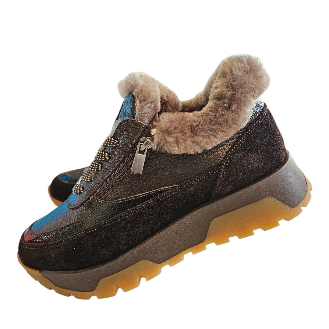 Stilingi moteriški sportinio tipo batai, pagaminti iš natūralios odos. Vidus išklotas šiltu natūraliu kailiu, kuris užtikrina komfortą ir jaukumą net šaltesnėmis dienomis. Patogus modelis su šoniniu užtrauktuku ir raišteliais leidžia lengvai pritaikyti prie pėdos, o masyvus guminis padas suteikia stabilumo ir patvarumo. Puikus pasirinkimas miesto stiliui derinant eleganciją, patogumą ir šilumą.