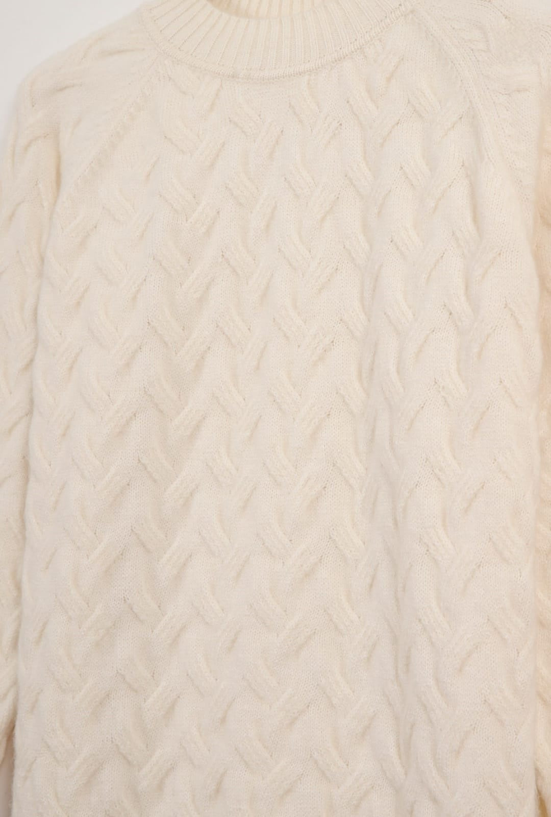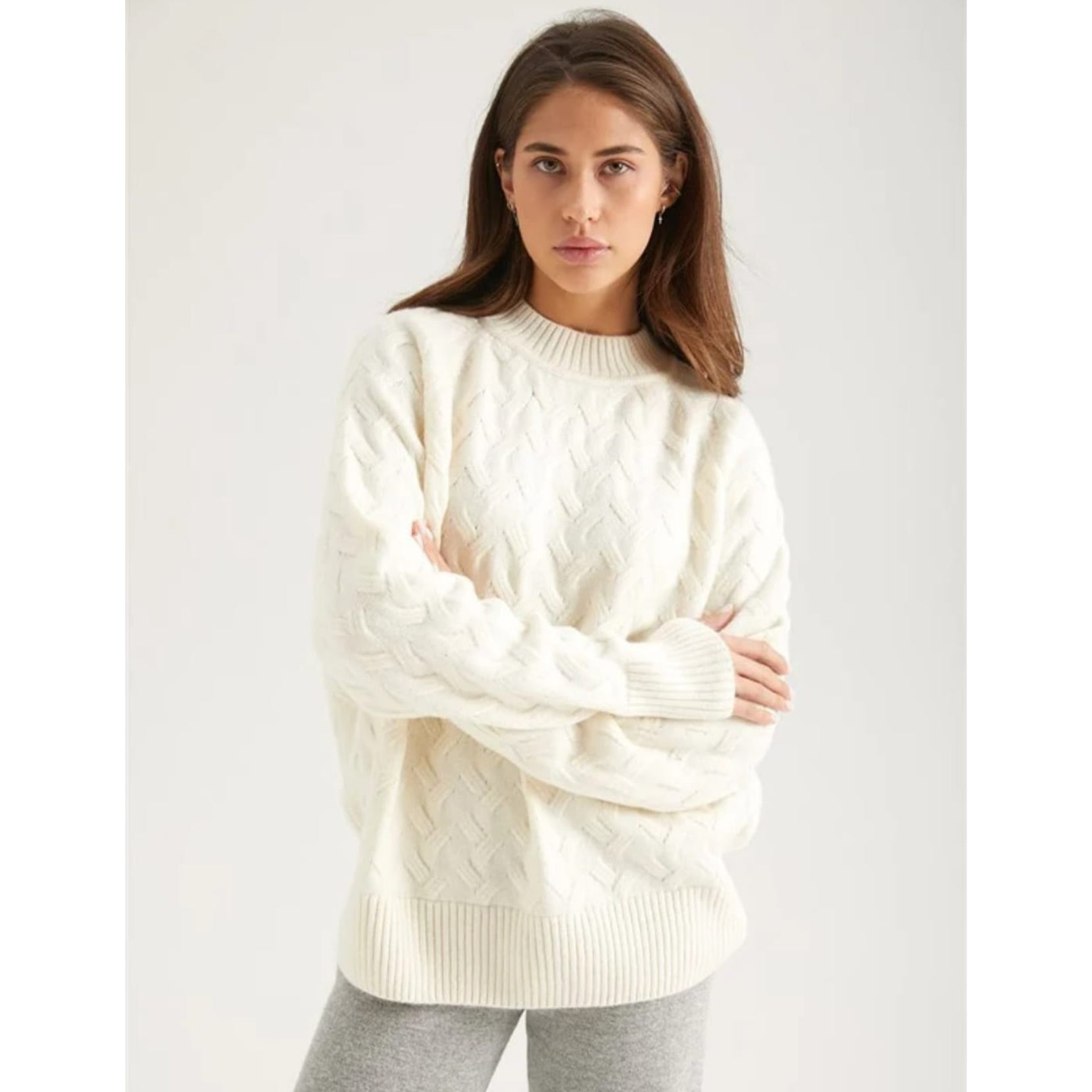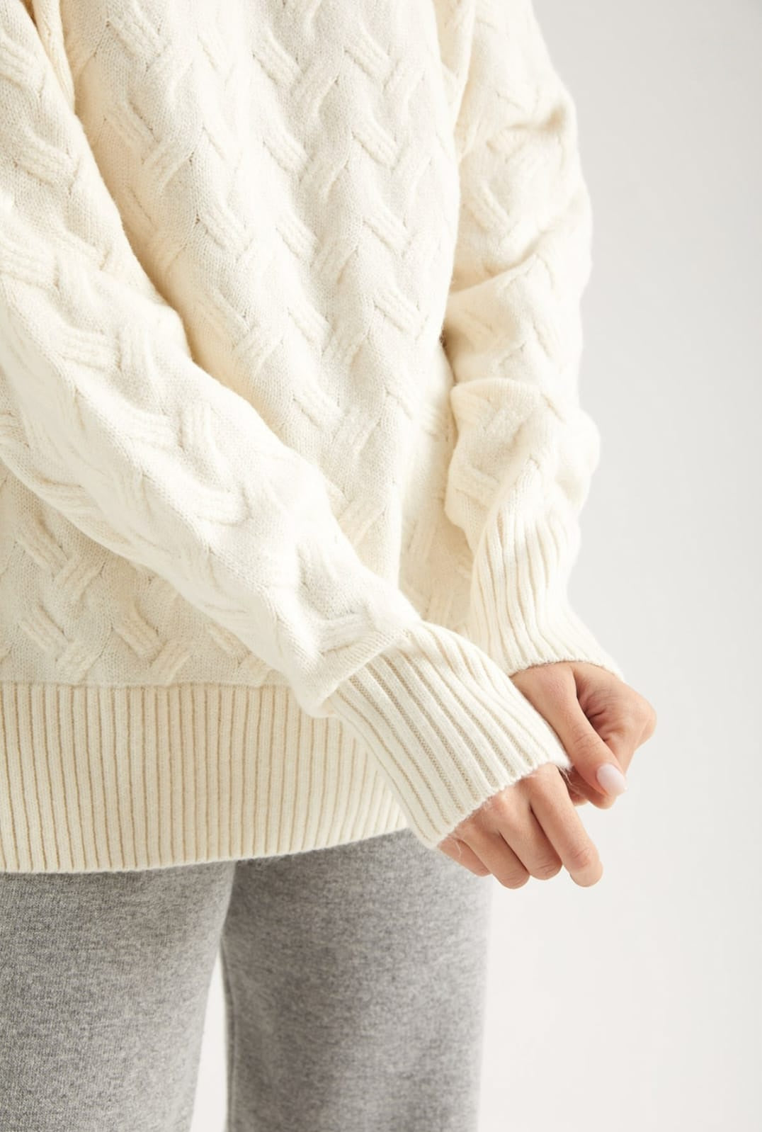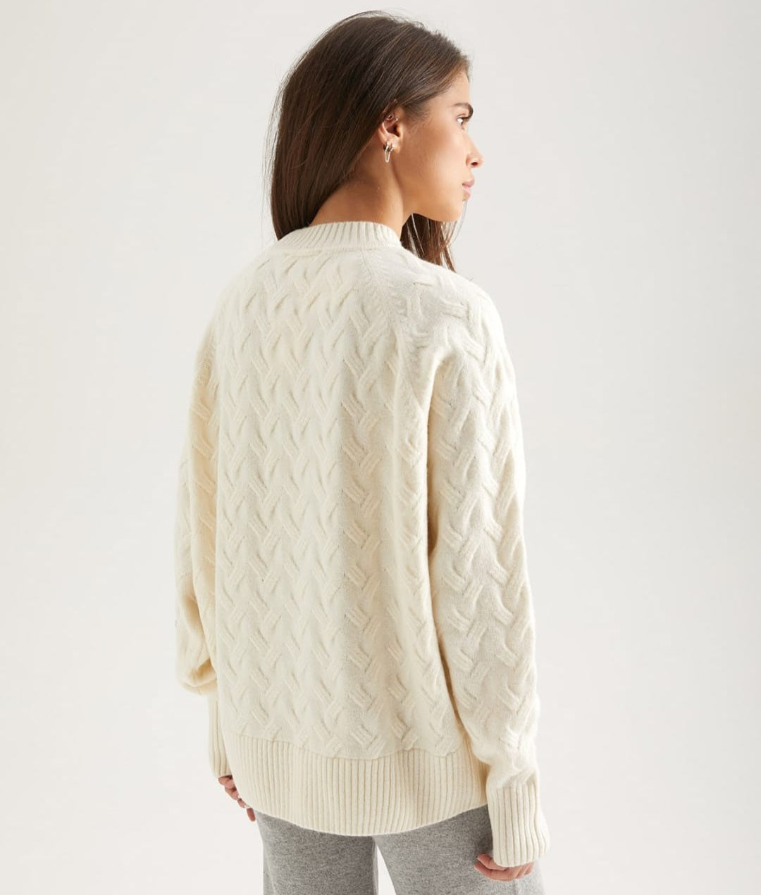 Minkštas, šiltai baltos spalvos, su mielu pynučių raštu ir modernaus „oversize“ stiliaus siluetu – idealus derinys tiek kasdienai, tiek jaukiems žiemos vakarams.