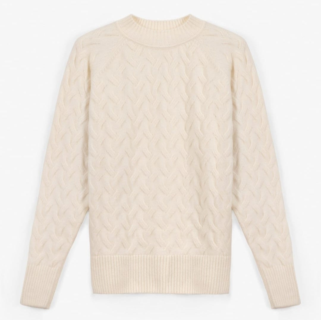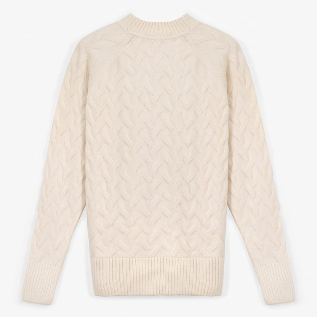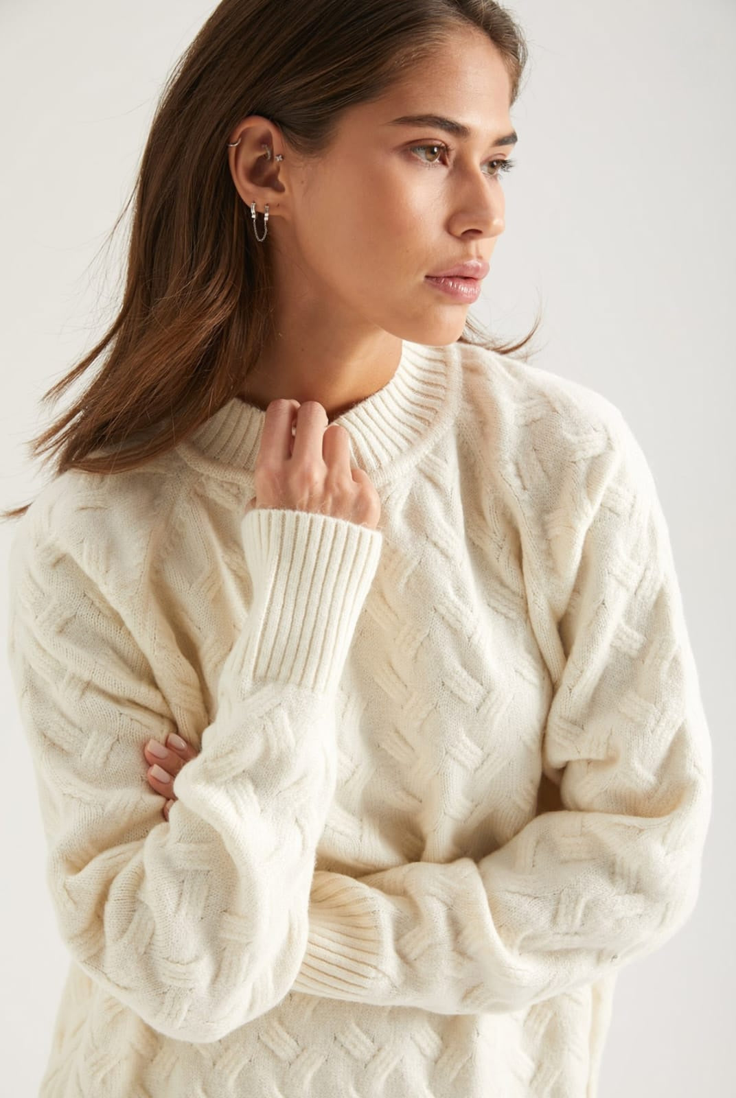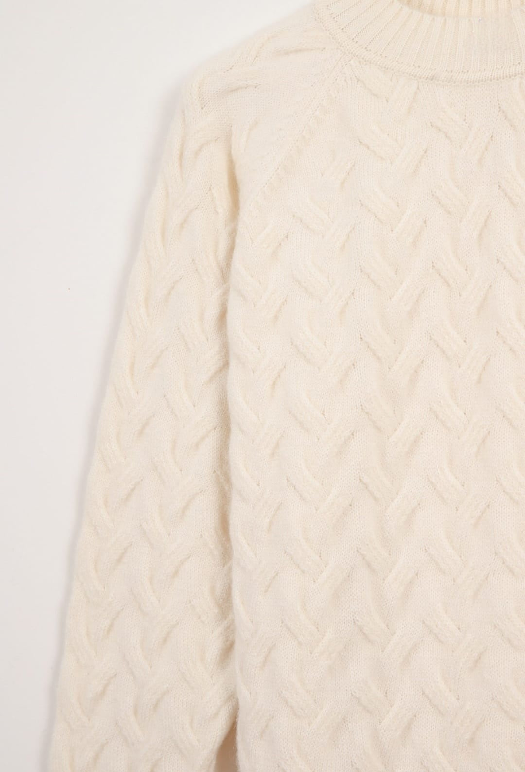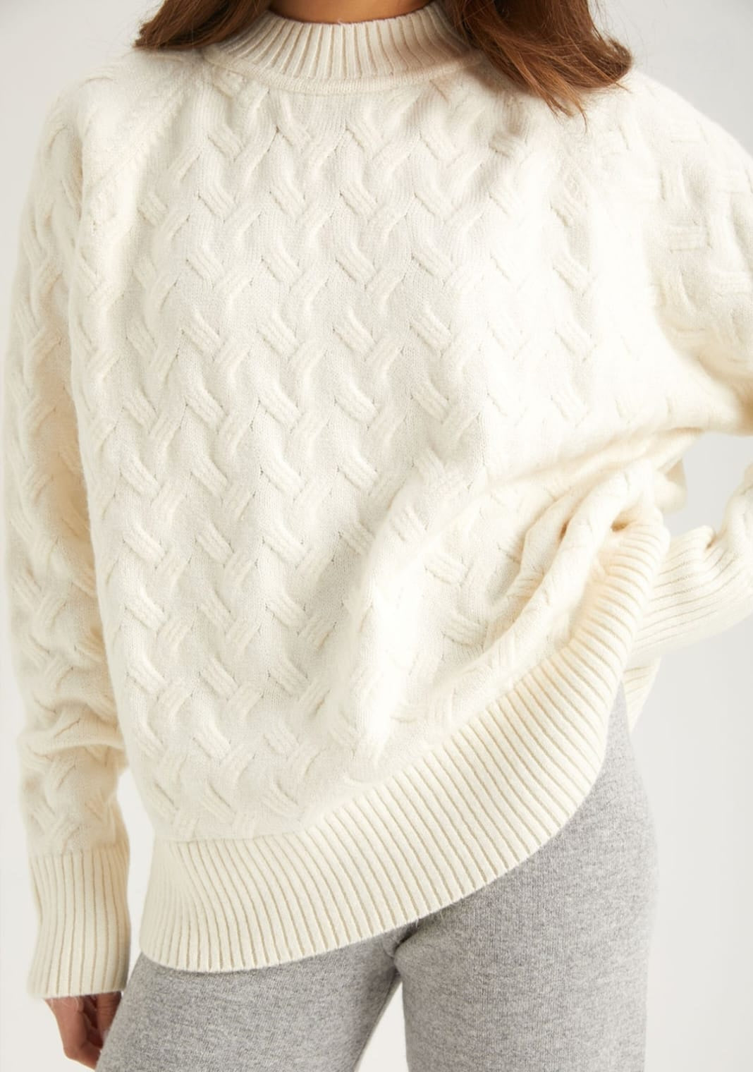 Minkštas, šiltai baltos spalvos, su mielu pynučių raštu ir modernaus „oversize“ stiliaus siluetu – idealus derinys tiek kasdienai, tiek jaukiems žiemos vakarams.