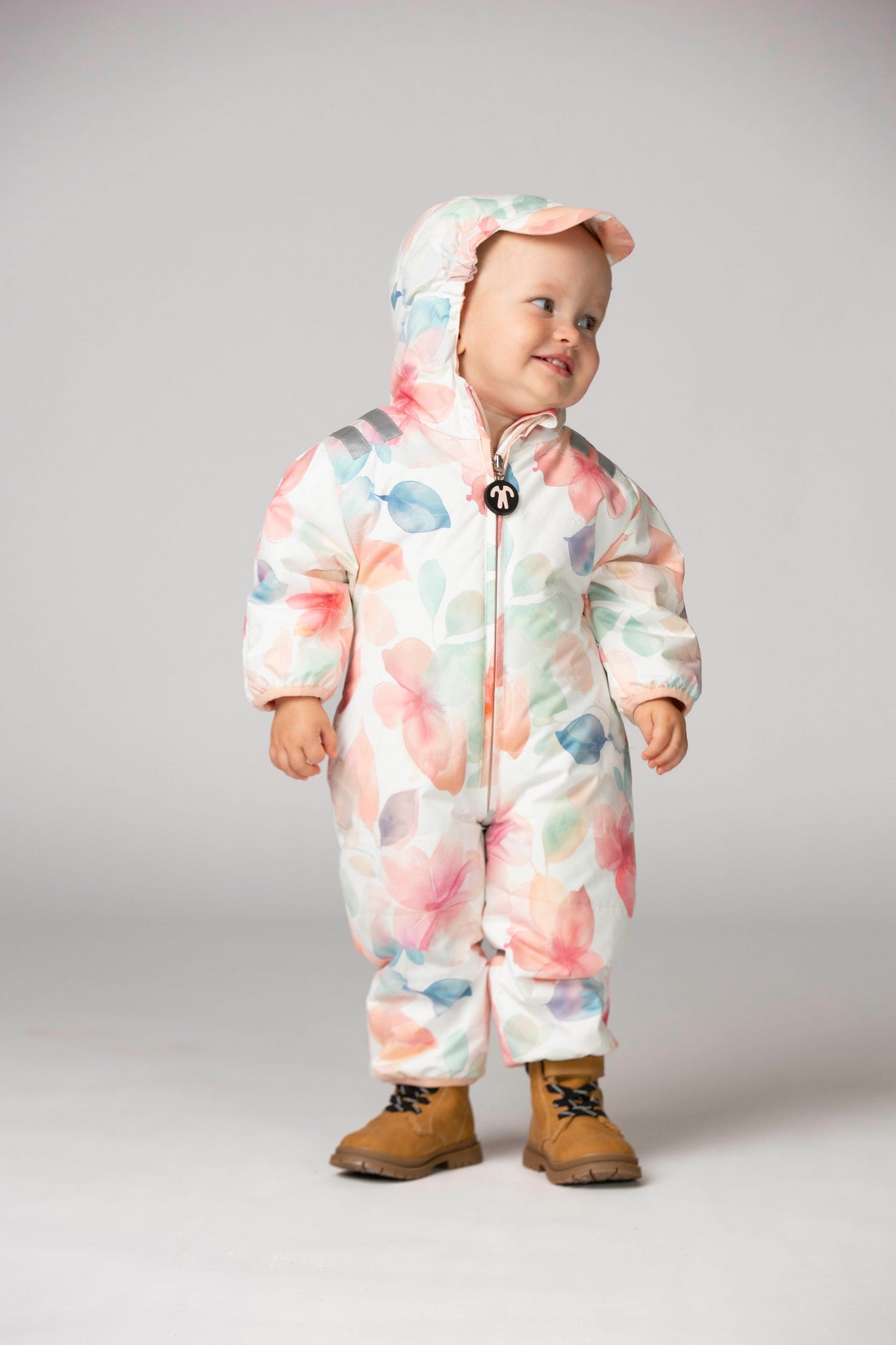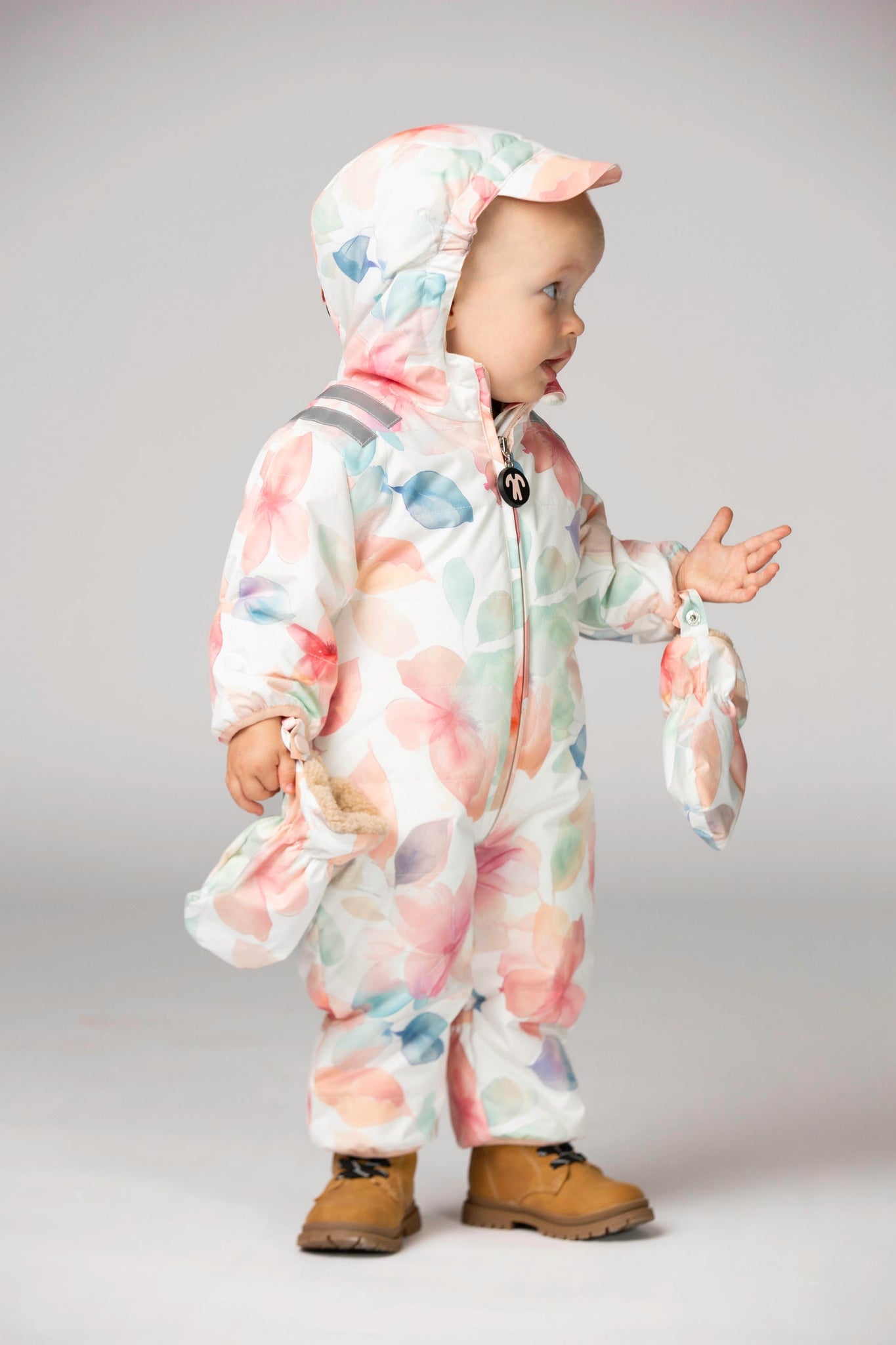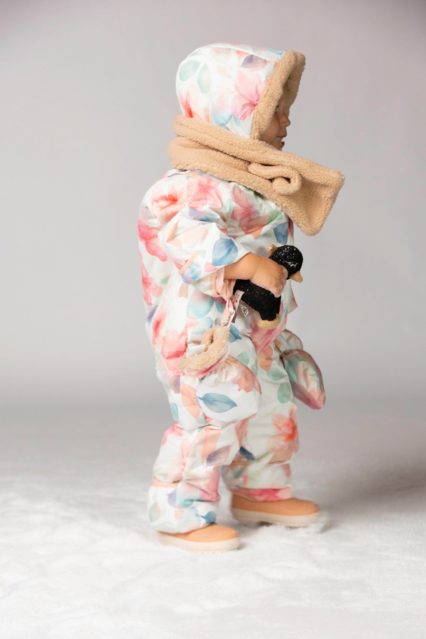 Techninis pašiltinimas užtikrina šilumą net šalčiausiomis dienomis, o ilgas užtrauktukas leidžia greitai ir patogiai pakeisti sauskelnes vos per minutę. Užlenkiamos rankyčių ir pėdučių dalys suteikia papildomos šilumos ir apsaugos nuo šalčio.