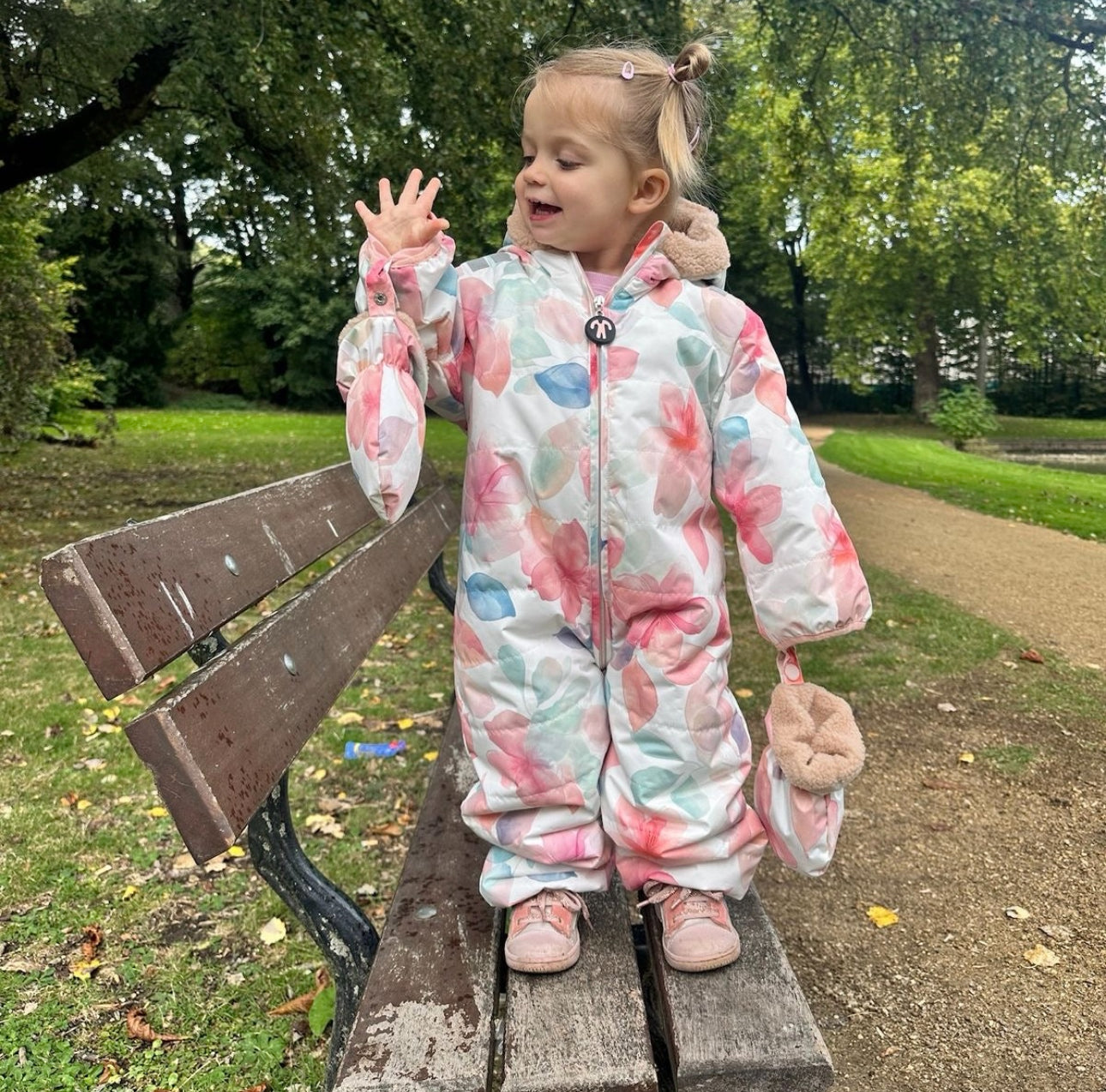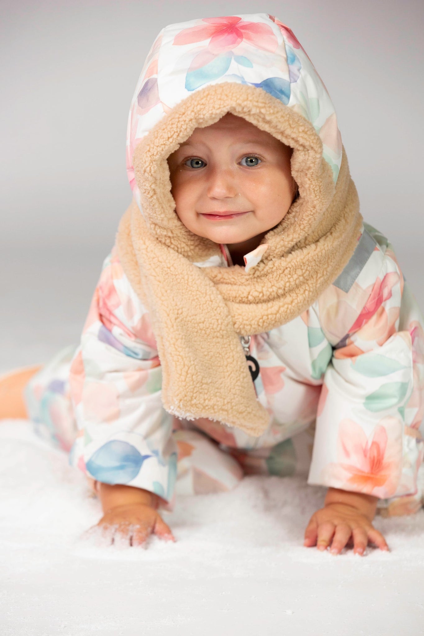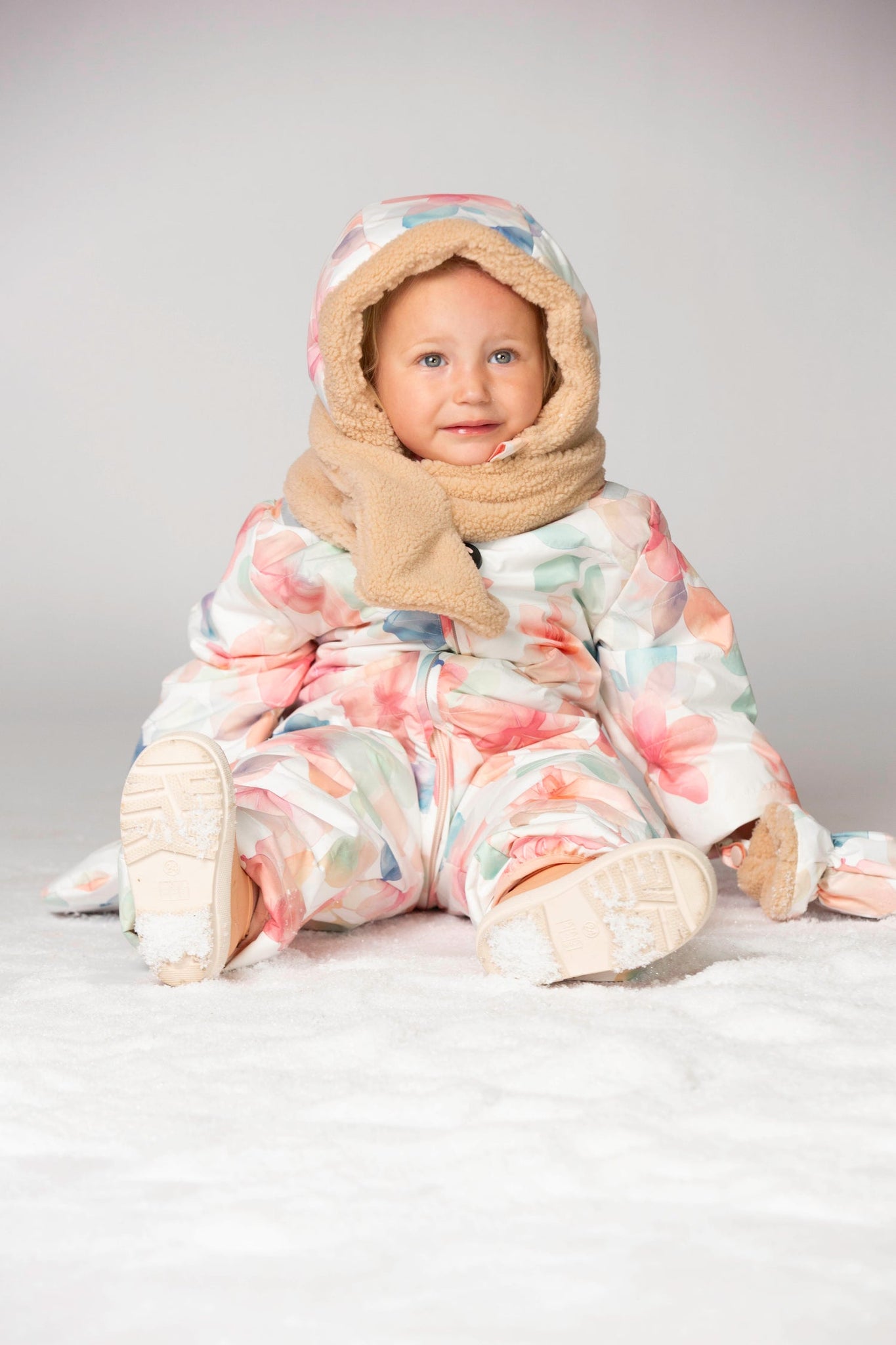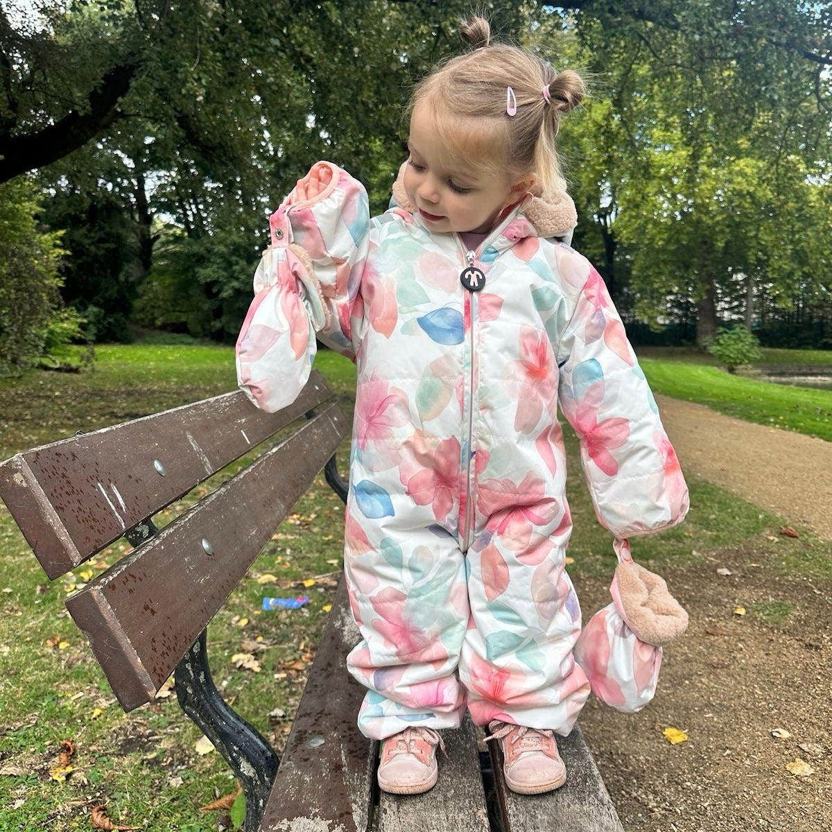 Techninis pašiltinimas užtikrina šilumą net šalčiausiomis dienomis, o ilgas užtrauktukas leidžia greitai ir patogiai pakeisti sauskelnes vos per minutę. Užlenkiamos rankyčių ir pėdučių dalys suteikia papildomos šilumos ir apsaugos nuo šalčio.
