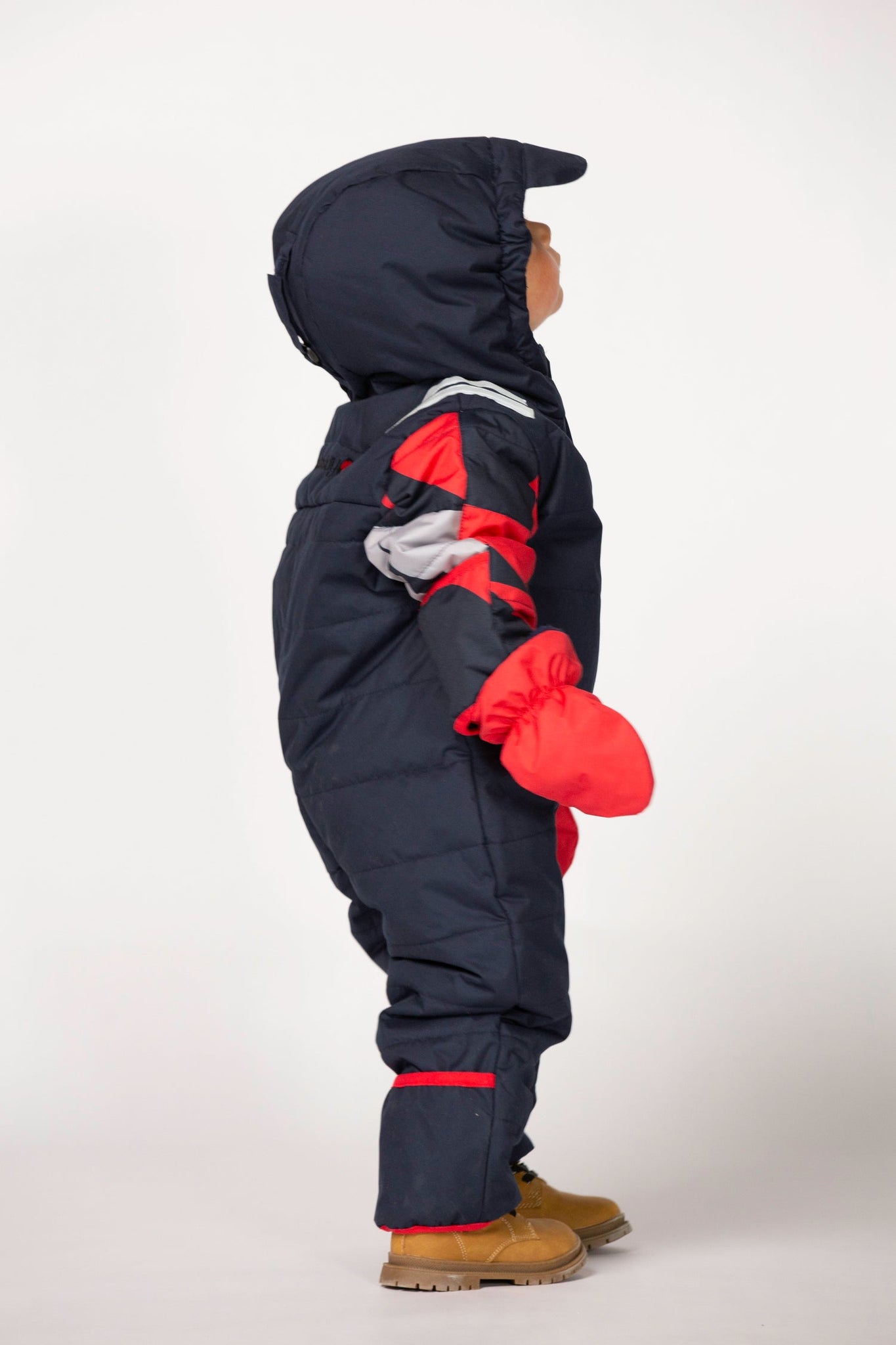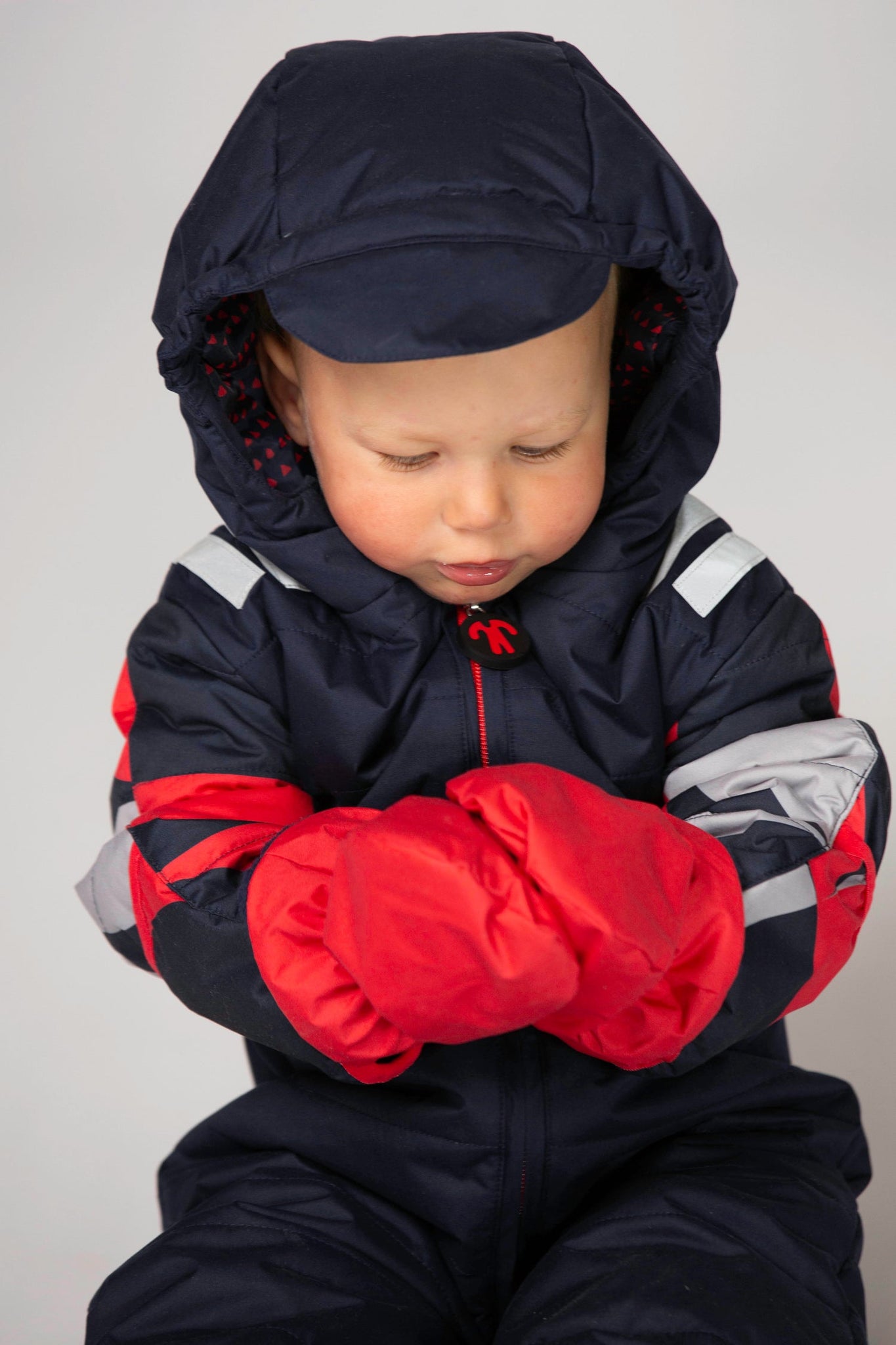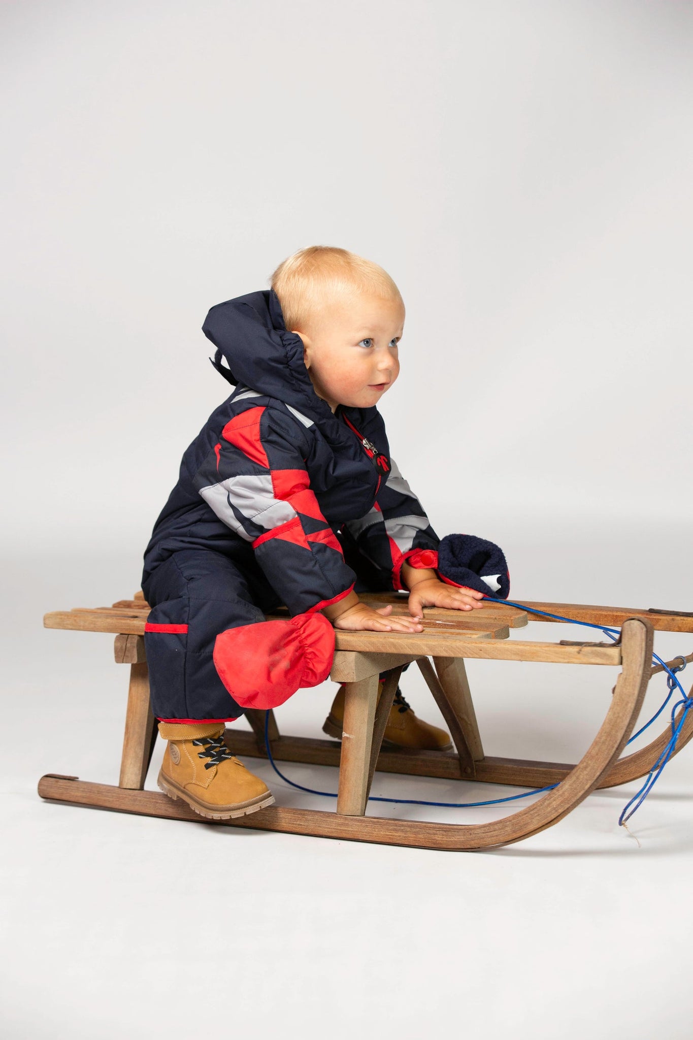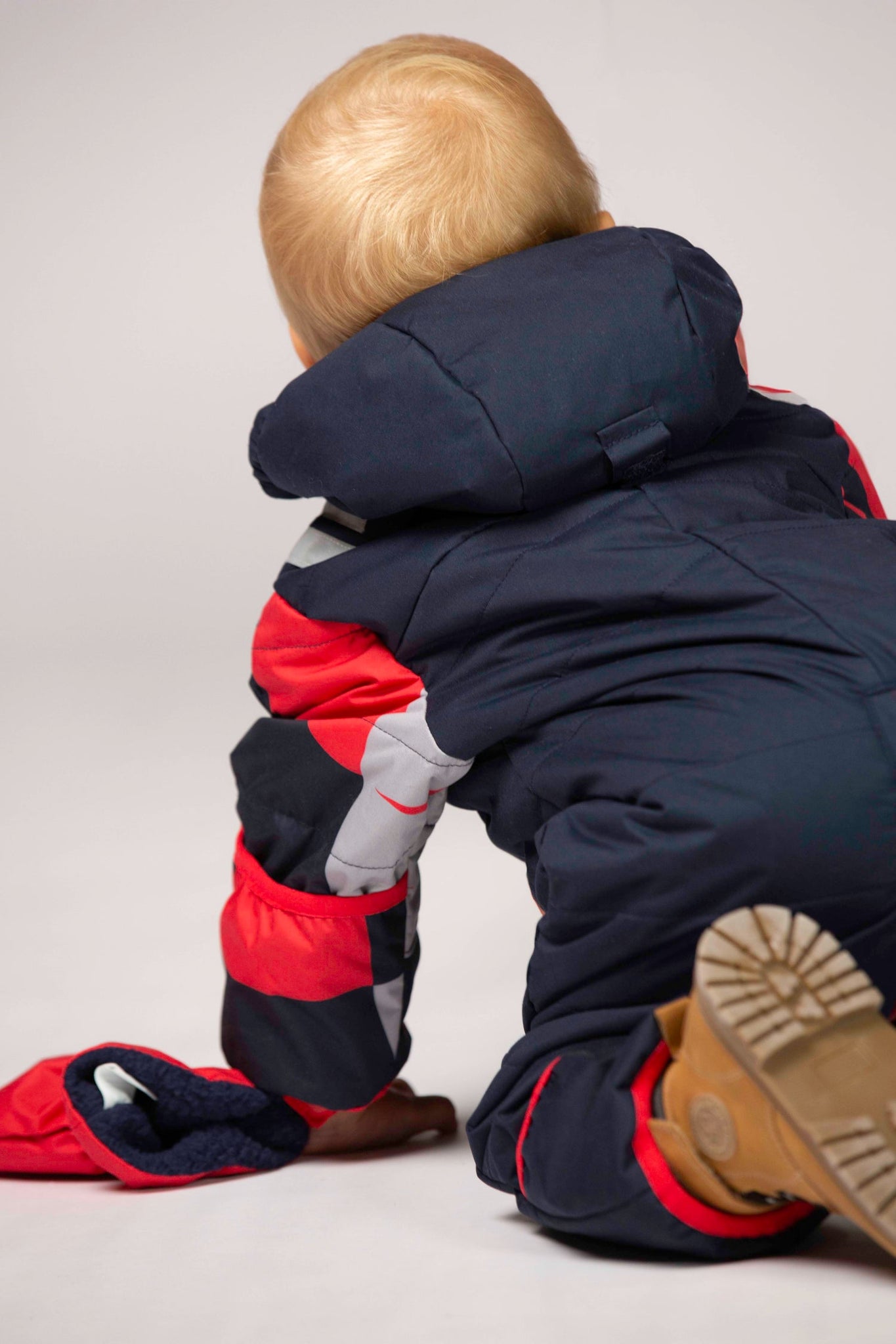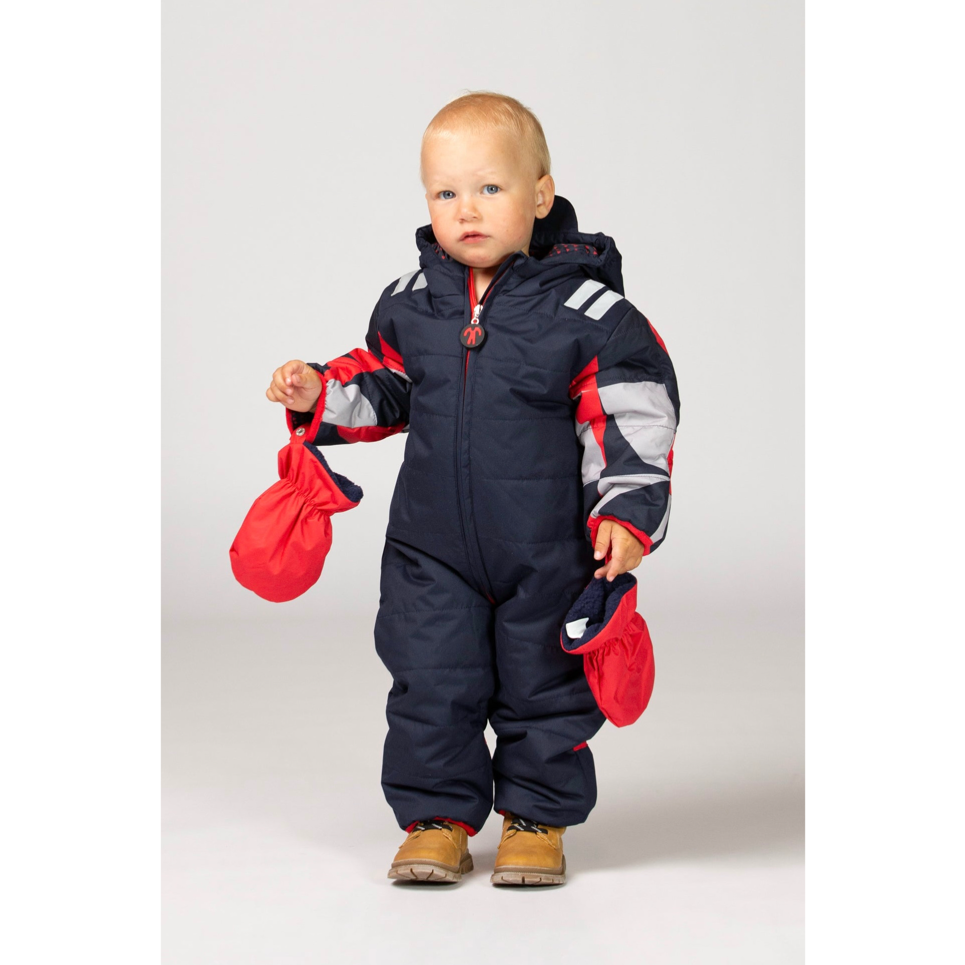Techninis pašiltinimas užtikrina šilumą net šalčiausiomis dienomis, o ilgas užtrauktukas leidžia greitai ir patogiai pakeisti sauskelnes vos per minutę. Užlenkiamos rankyčių ir pėdučių dalys suteikia papildomos šilumos ir apsaugos nuo šalčio.