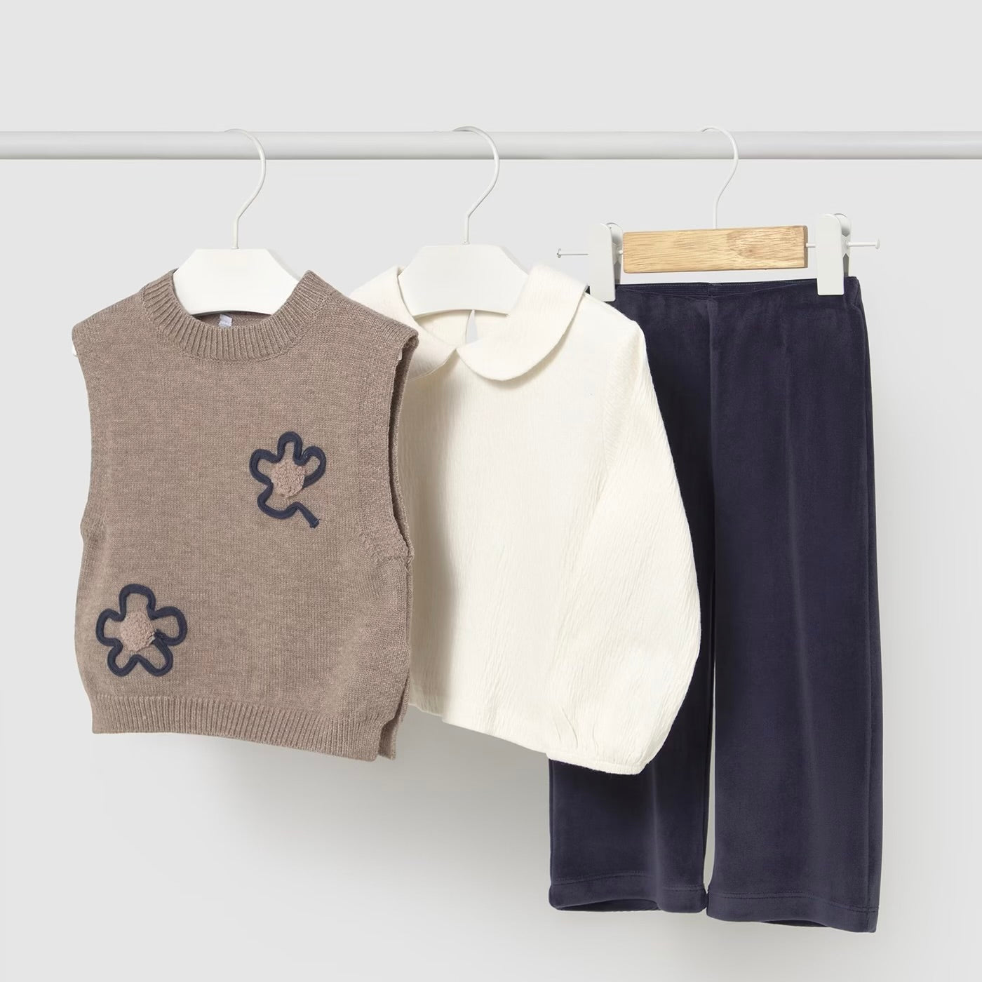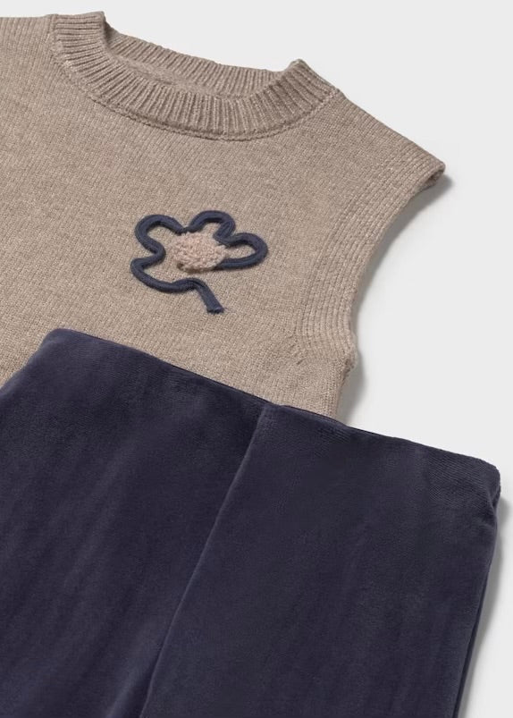 Sudėtis: palaidinė-97% med, 2% poliesteris, 1% elastanas, aksominės kelnės-95% poliesteris, 5% elastanas, liemenė-31% akrilas, 26% poliesteris, 21% poliamidas, 19% viskozė.