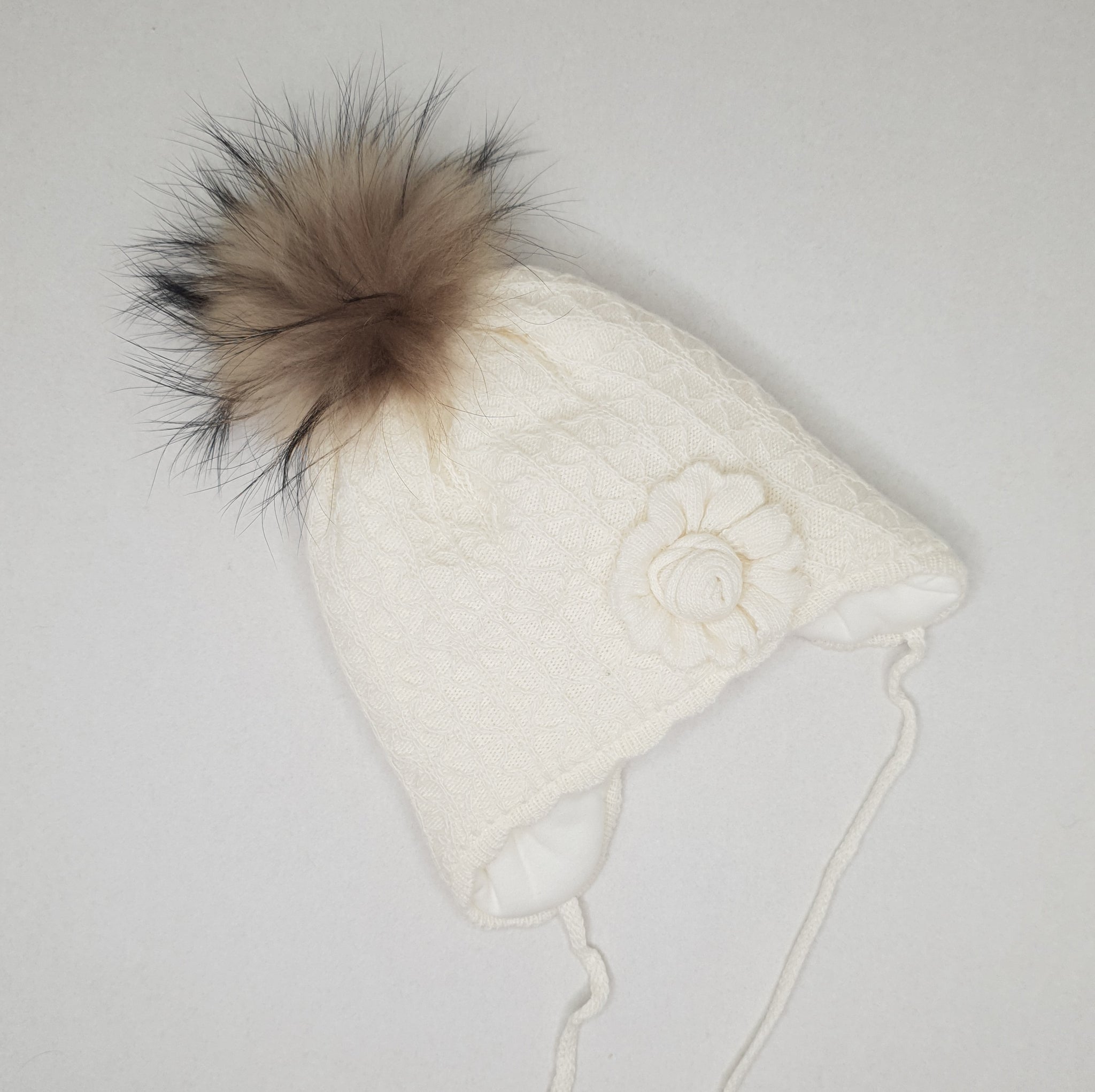 Žieminė kepurė mergaitei su natūralaus kailio pomponu. Kepurė turi medvilninį pamušalą.